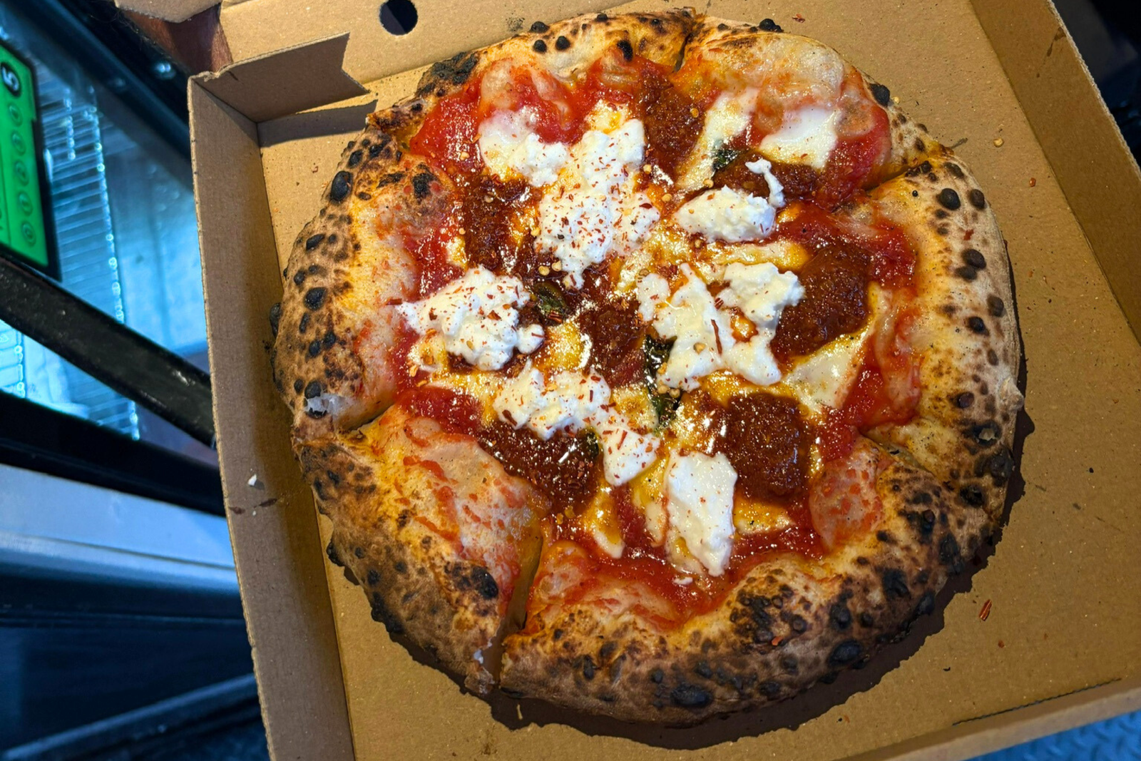 Tomato Base, Mozzarella, Gran Moravia, Burrata Dollops, Nduja (spicy), Chilli Flakes